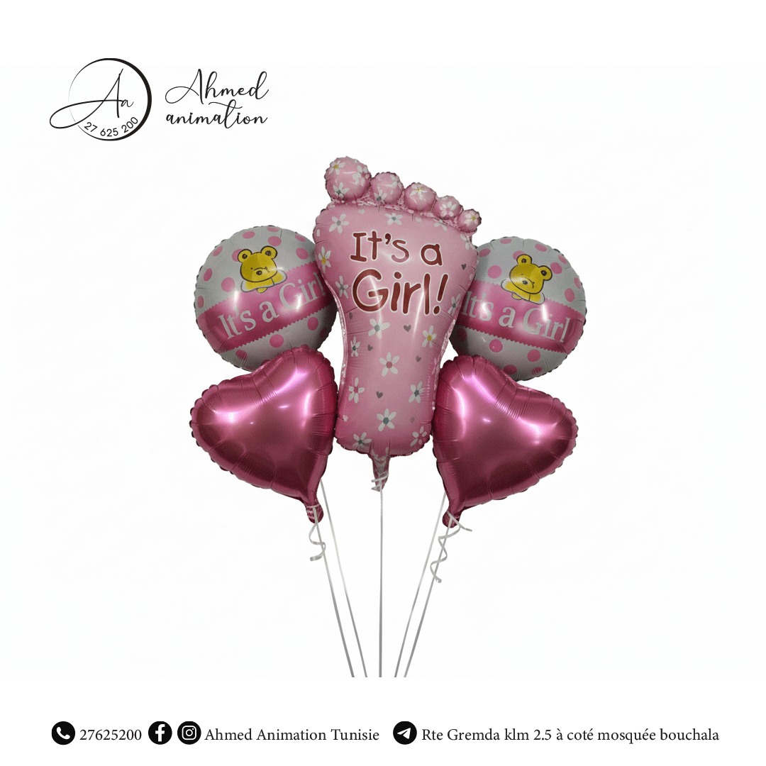 Accueillez la naissance d’une petite princesse avec ce magnifique bouquet de ballons It’s a Girl! composé de cinq ballons en aluminium : deux en forme de cœur, deux ronds décorés d’un adorable ourson, et un grand ballon en forme de pied. Idéal pour une baby shower, une décoration de maternité ou une fête de naissance, ce bouquet apporte une touche festive et tendre à votre événement. Facile à gonfler à l’hélium ou à l’air, il crée une ambiance joyeuse et inoubliable pour célébrer ce moment unique.