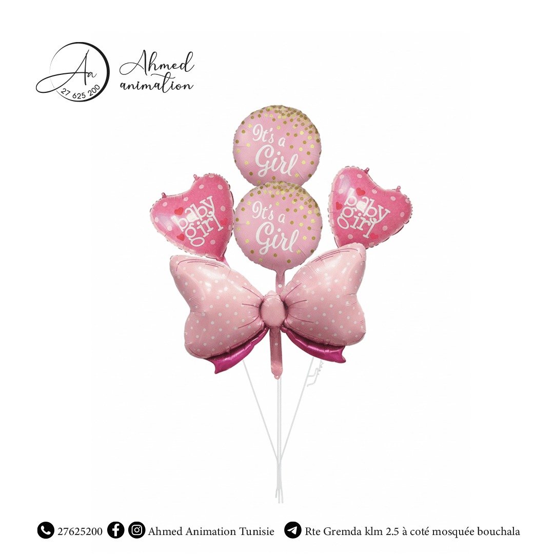 Ce magnifique bouquet de ballons Nœud Rose It’s a Girl! est l’accessoire idéal pour fêter l’arrivée d’une petite princesse. Composé de cinq ballons en aluminium — deux en forme de cœur “Baby Girl”, deux ronds “It’s a Girl!” et un grand ballon central en forme de nœud rose à pois — il apporte une touche de douceur et d’élégance à toute décoration de baby shower, fête de naissance ou chambre de maternité. Facile à gonfler à l’air ou à l’hélium, ce bouquet crée une ambiance tendre, joyeuse et pleine d’amour pour accueillir le nouveau trésor de la famille.