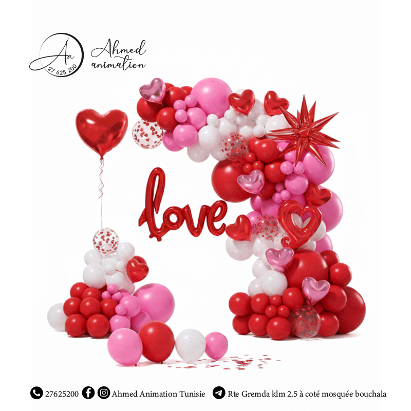 • Thème Saint-Valentin : Inclut des ballons en aluminium géants en forme de cœurs rouges et un grand ballon lettrage « Love » pour une immersion totale dans une ambiance passionnée.