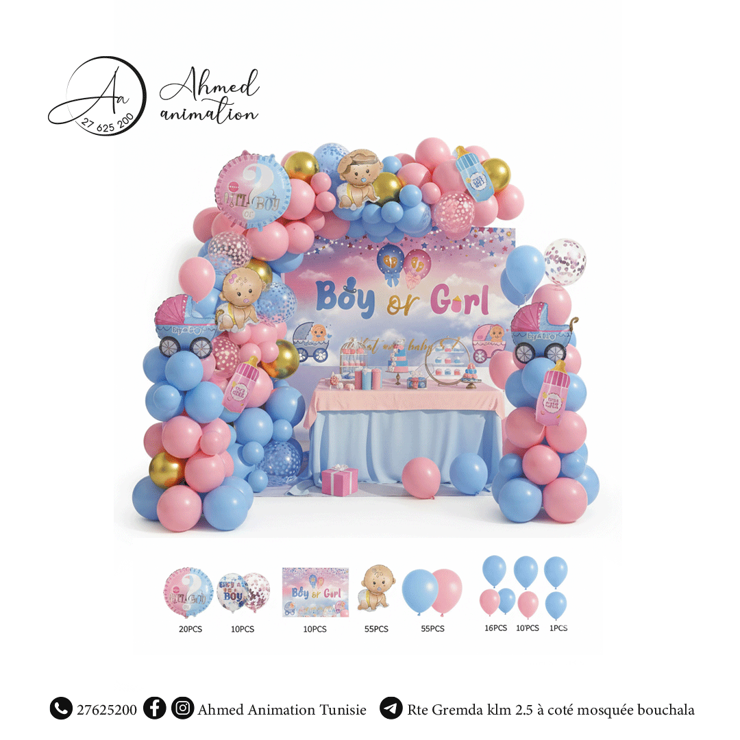 Thème Baby Shower / Gender Reveal : Inclut des ballons en aluminium géants en forme de bébé, de biberons (rose et bleu) et de poussettes, ainsi qu’un grand ballon mystère « Boy or Girl ? » pour une immersion totale.
